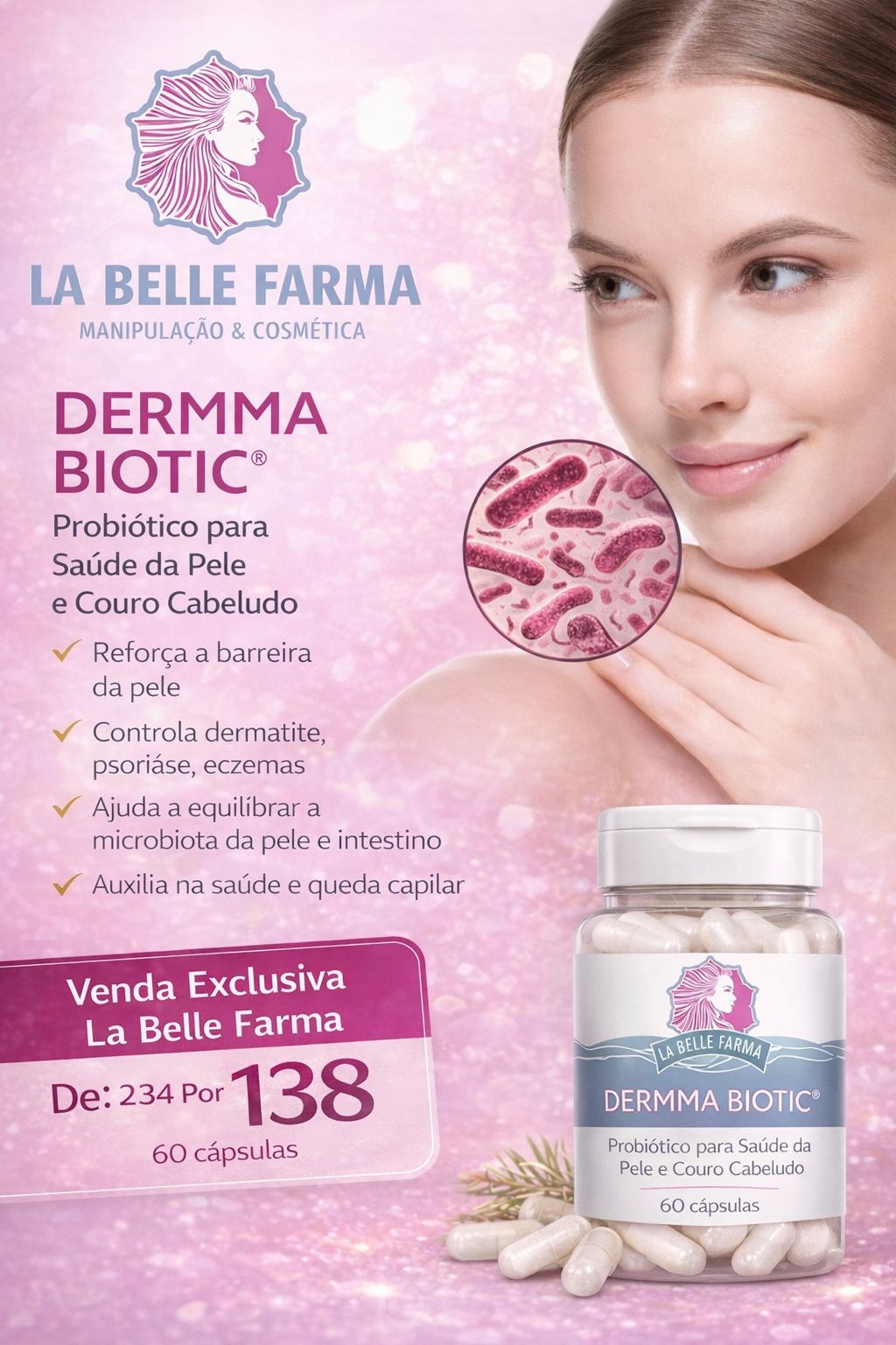 Probiótico formulado para atuar no eixo intestino-pele, auxiliando no equilíbrio da microbiota e na saúde da pele e do couro cabeludo.