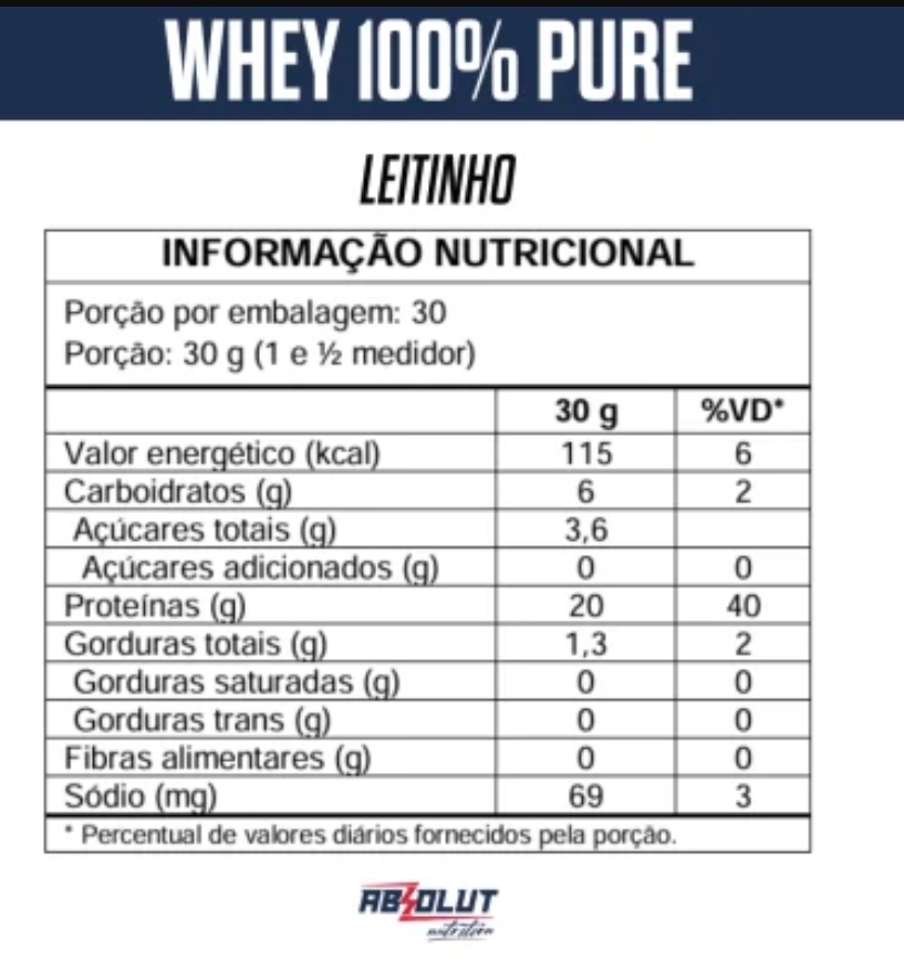 O Whey Concentrado 100% pure da Absolut Nutrition é uma proteína de alta qualidade ideal para quem busca ganho de massa muscular e recuperação rápida após os treinos, além de ser um excelente aliado para quem precisa bater a meta diária de proteína. Ele fornece todos os aminoácidos essenciais para o corpo, ajudando no crescimento e na manutenção dos músculos. Adoçado com stevia, um adoçante 100% natural, possui uma saborização excepcional, o que faz do nosso Whey o mais procurado do mercado.